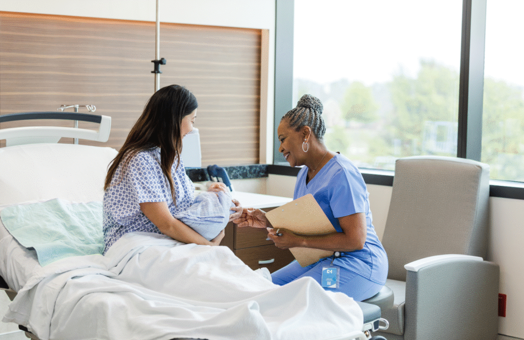 Once your baby is born, the focus shifts from labour to recovery and bonding. Immediately after delivery, your baby will be placed on your chest for skin-to-skin contact, which helps regulate their body temperature, heart rate, and breathing. This close contact also triggers bonding hormones and supports early breastfeeding.
